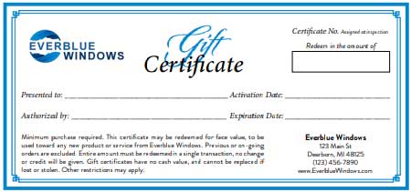 Minimum purchase required. This certificate may be redeemed for face value, to be used toward any new product or service from Lighthouse Exteriors. Previous or on-going orders are excluded. Entire amount must be redeemed in a single transaction, no change or credit will be given. Gift certificates have no cash value, and cannot be replaced if lost or stolen. Other restrictions may apply